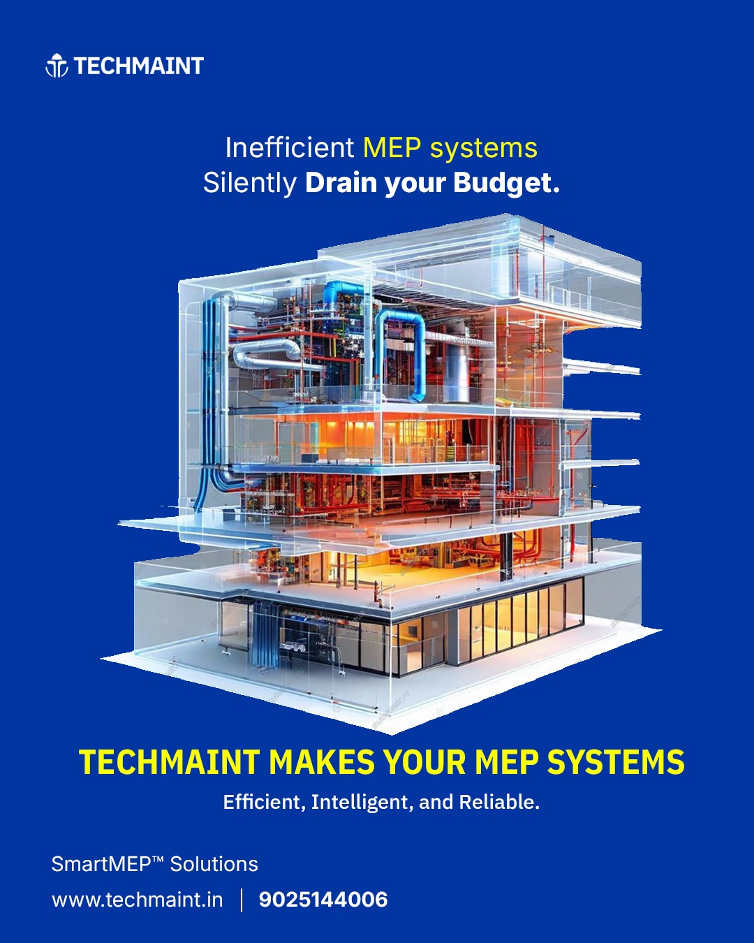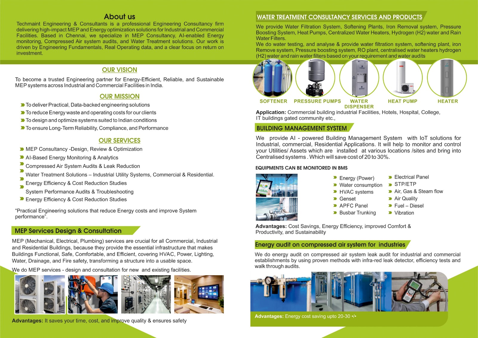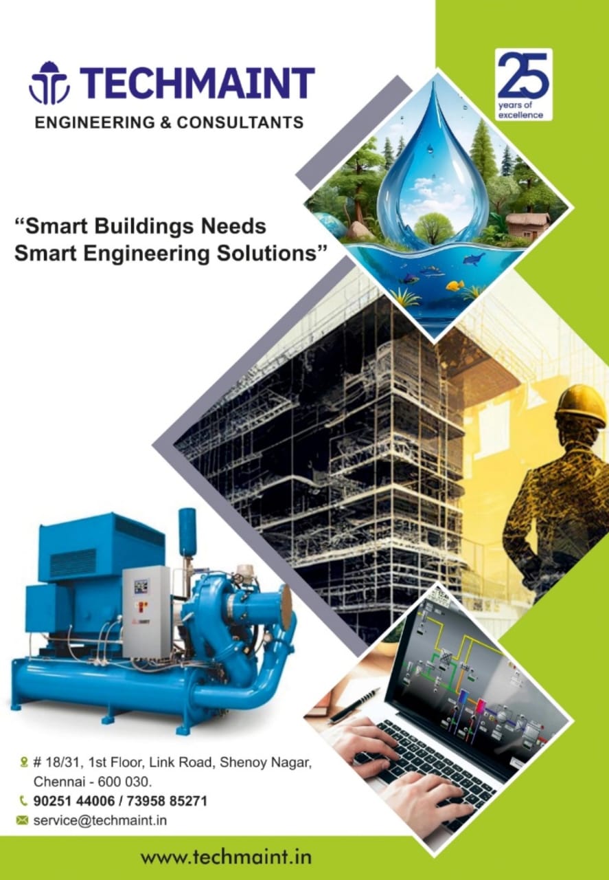 Techmaint Engineering & Consultants is an Engineering Consulting firm with over 25 years of field experience specialized in Industrial Projects , All kinds of Buildings, Mechanical & Electrical Equipments Operation & Maintenance , Water Treatment solutions , Energy Audits serving for Industrial , Commercial and Residential properties. With a commitment to optimizing the Assets and Building performance and Enhancing the Lifespan of Facilities and Equipments , We provide Tailored Projects, Energy Efficient Consultancy and End to end Maintenance solutions for Industries, Hotels , Hospitals , IT Buildings, Gated Communities, Educational Institutions, that ensure Safety, Efficiency , Cost Saving upto 30% and Compliance.